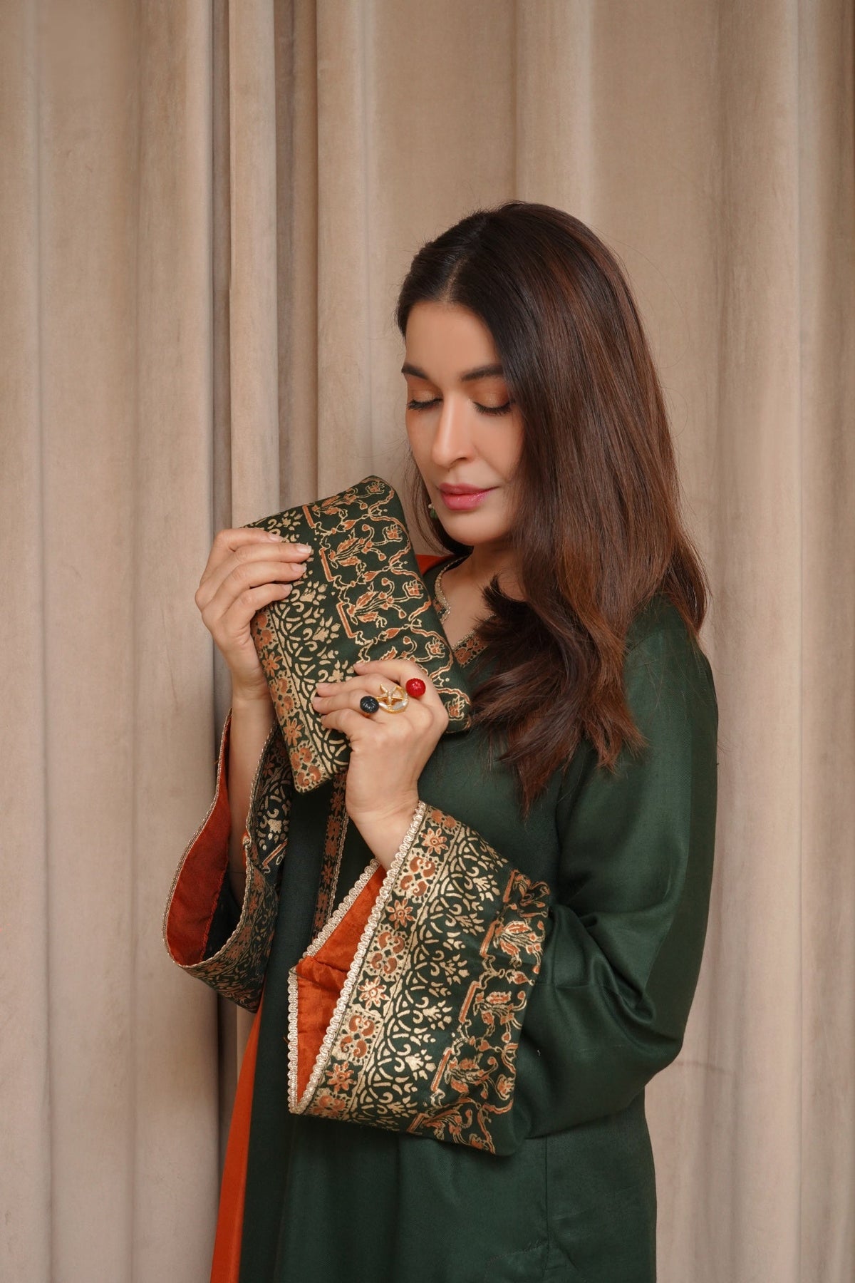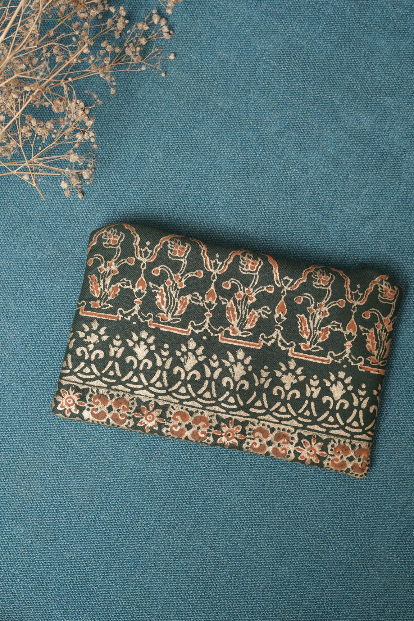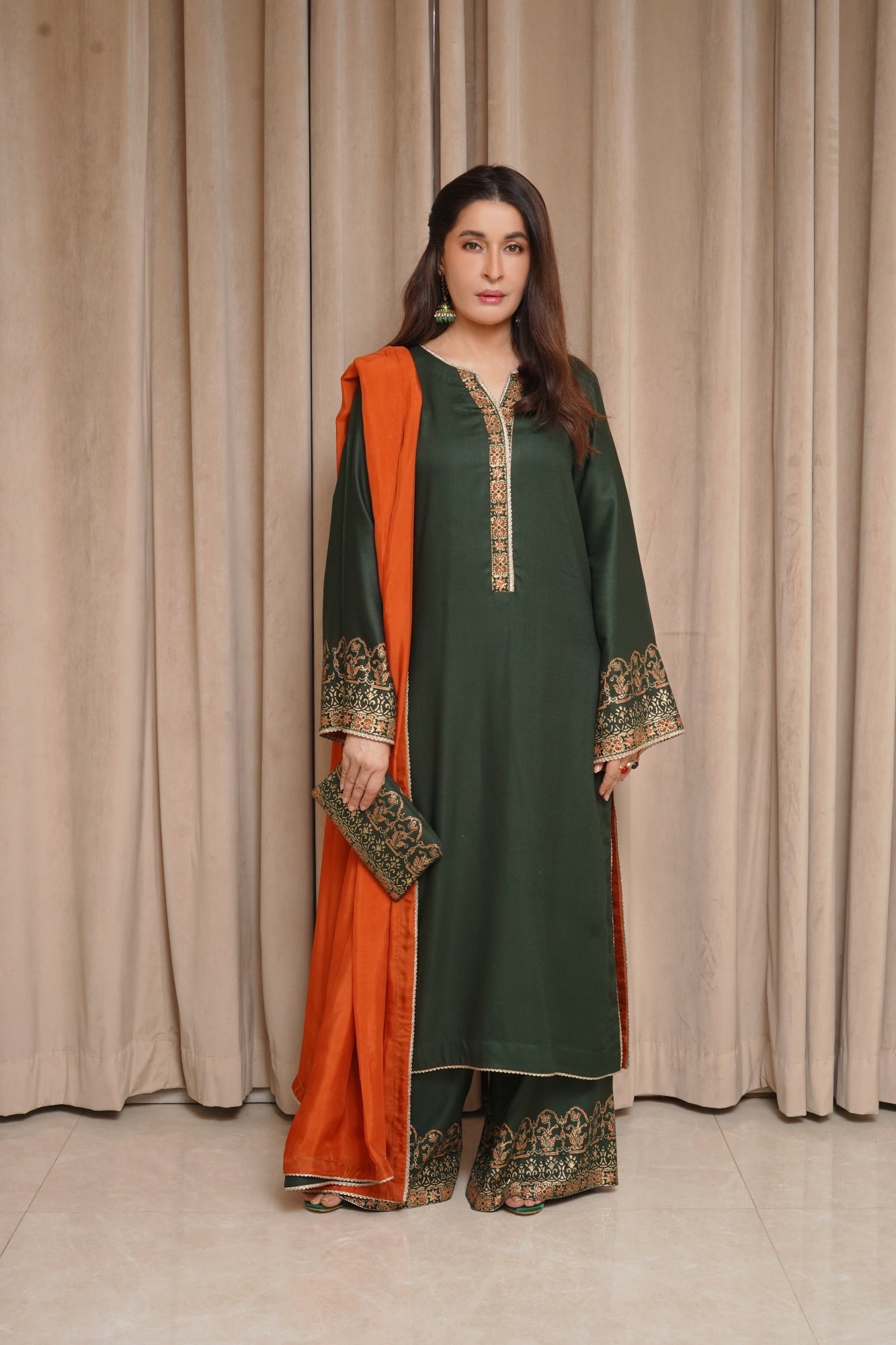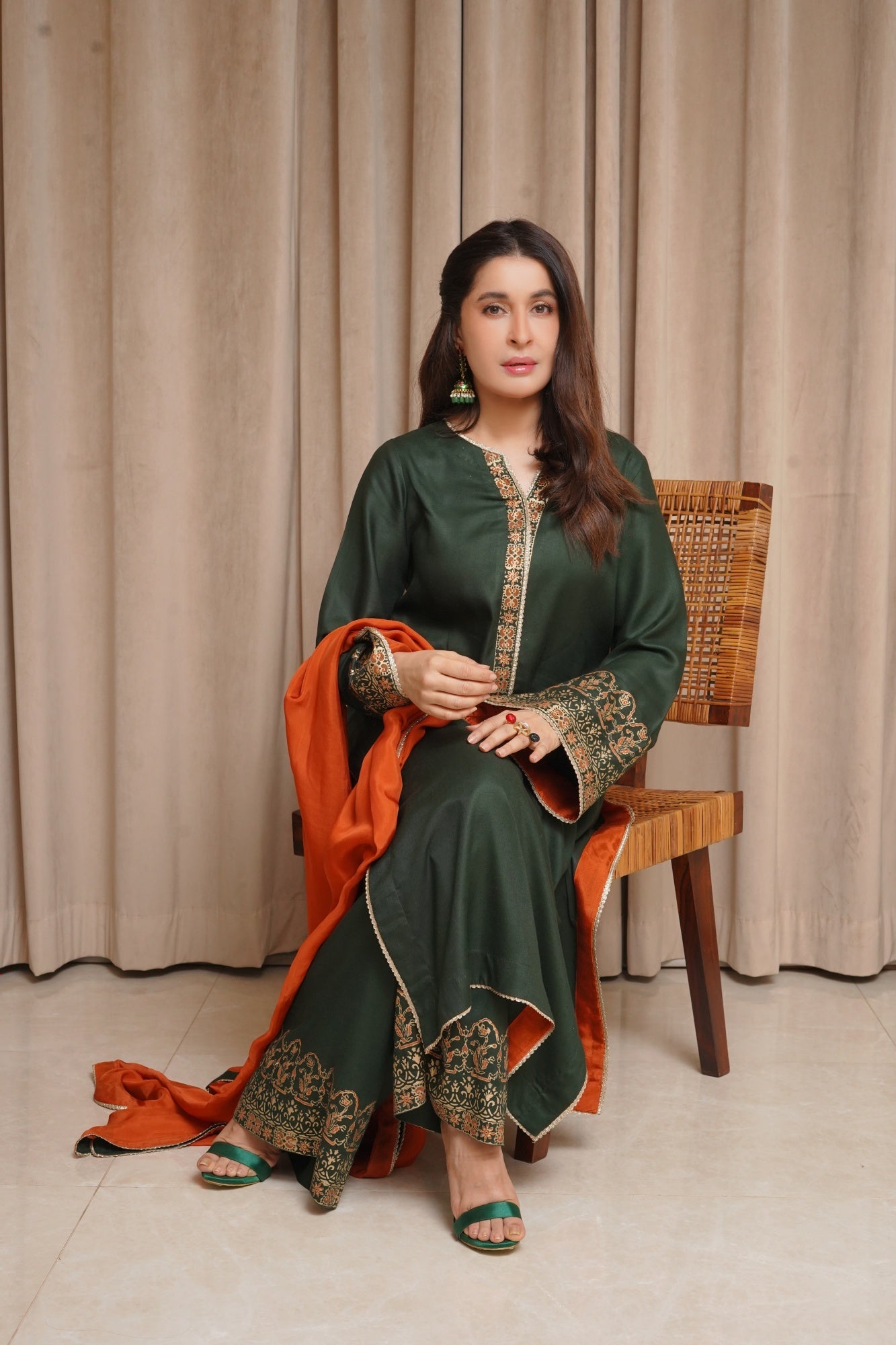 Sabza showcases an exquisite hand block print on the shirt and sleeves, complemented by culottes pants and a luxurious silk dupatta.