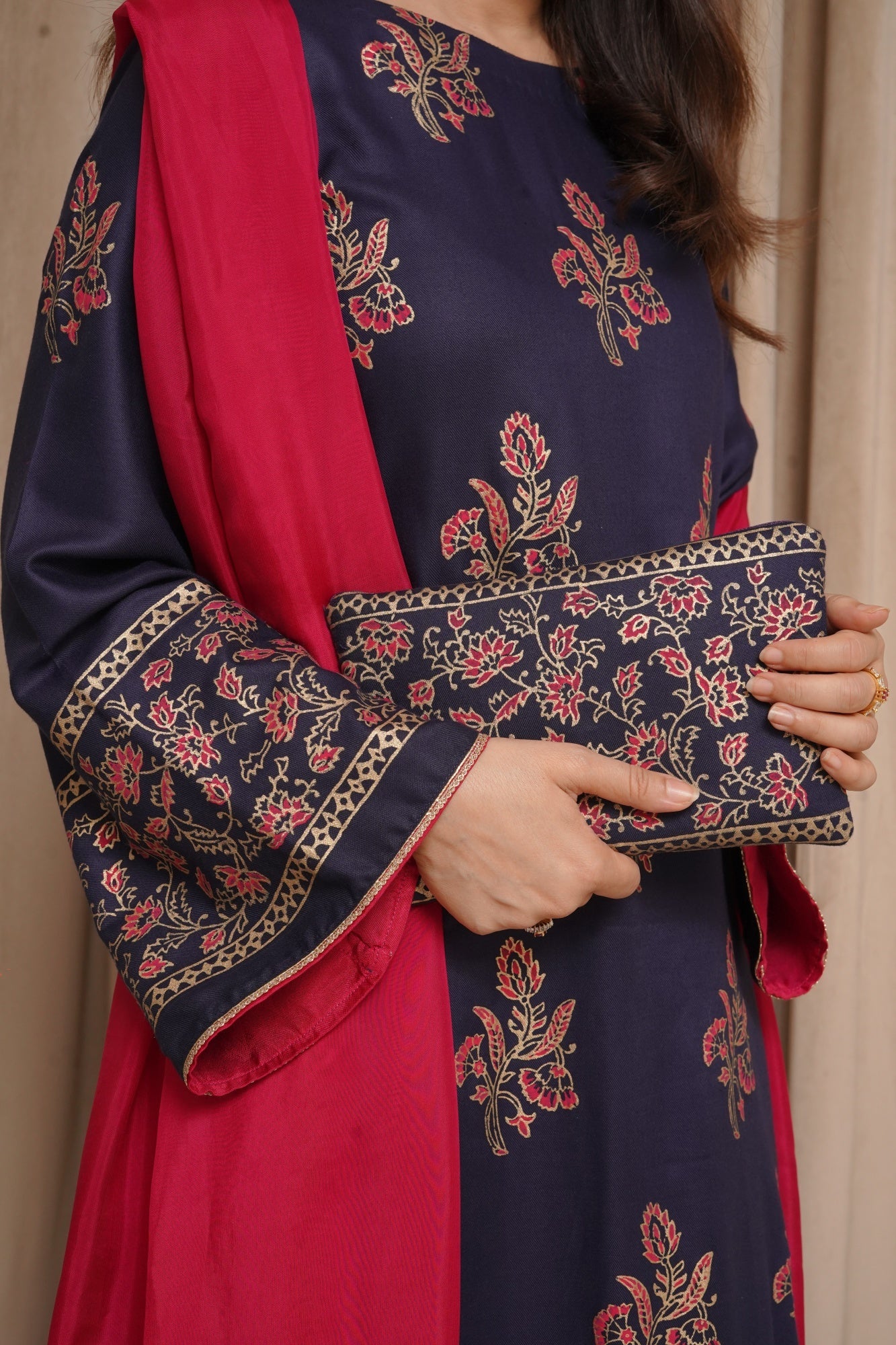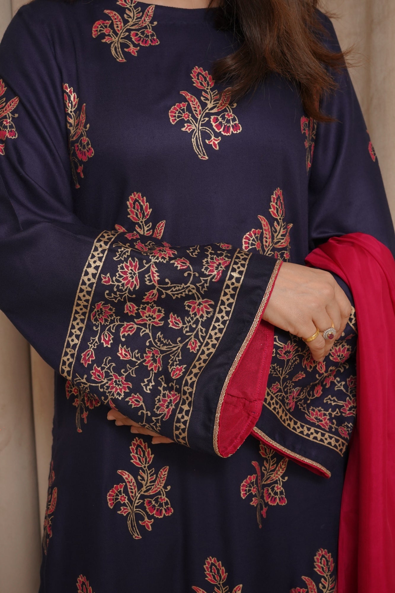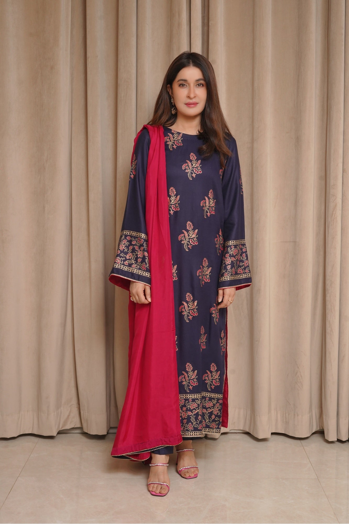 This Samandar article features a luxurious hand block print on the shirt and sleeves, paired with straight pants and a silk dupatta.