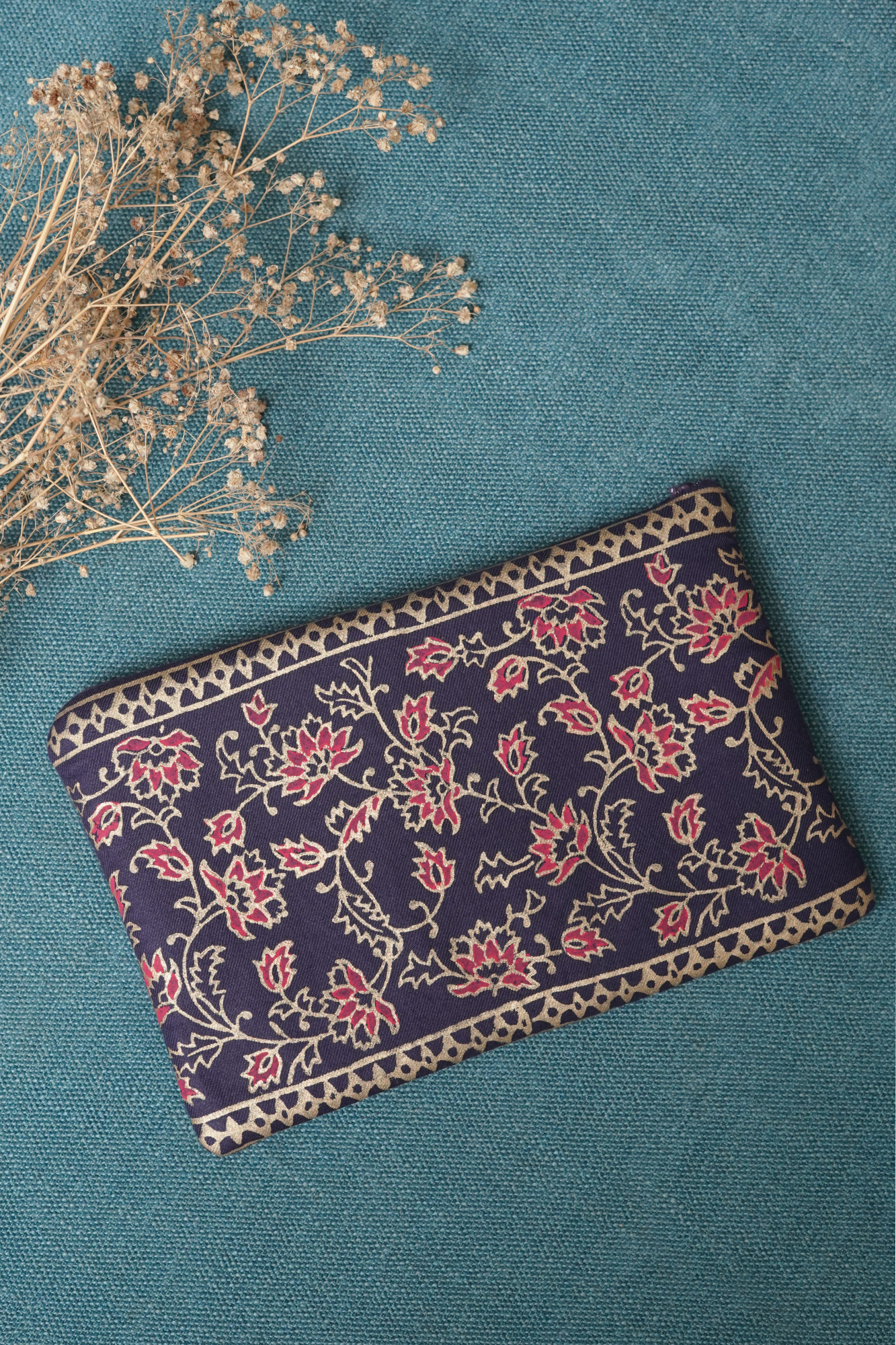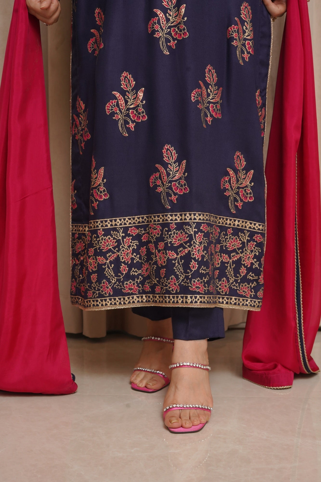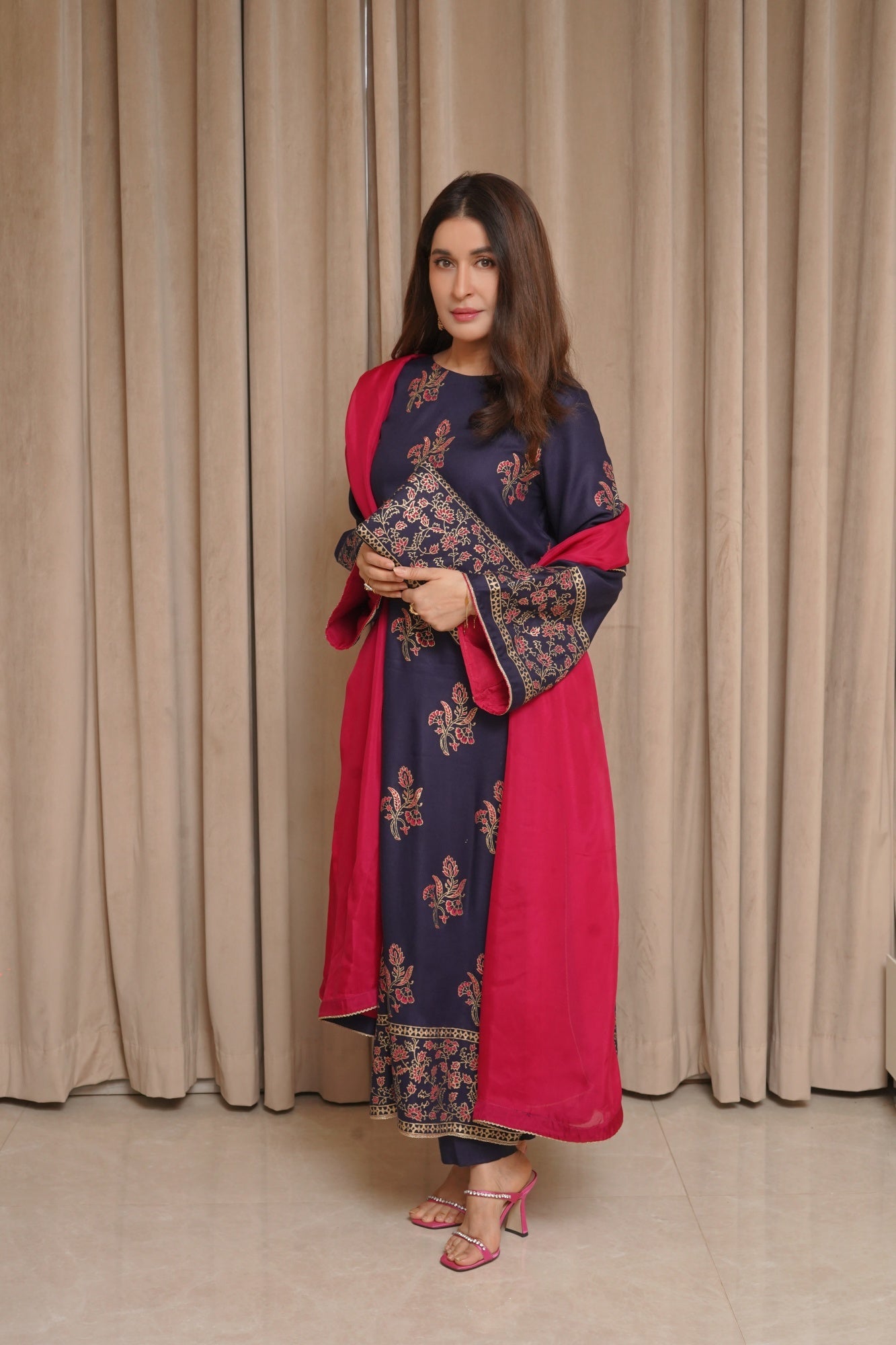 This Samandar article features a luxurious hand block print on the shirt and sleeves, paired with straight pants and a silk dupatta.